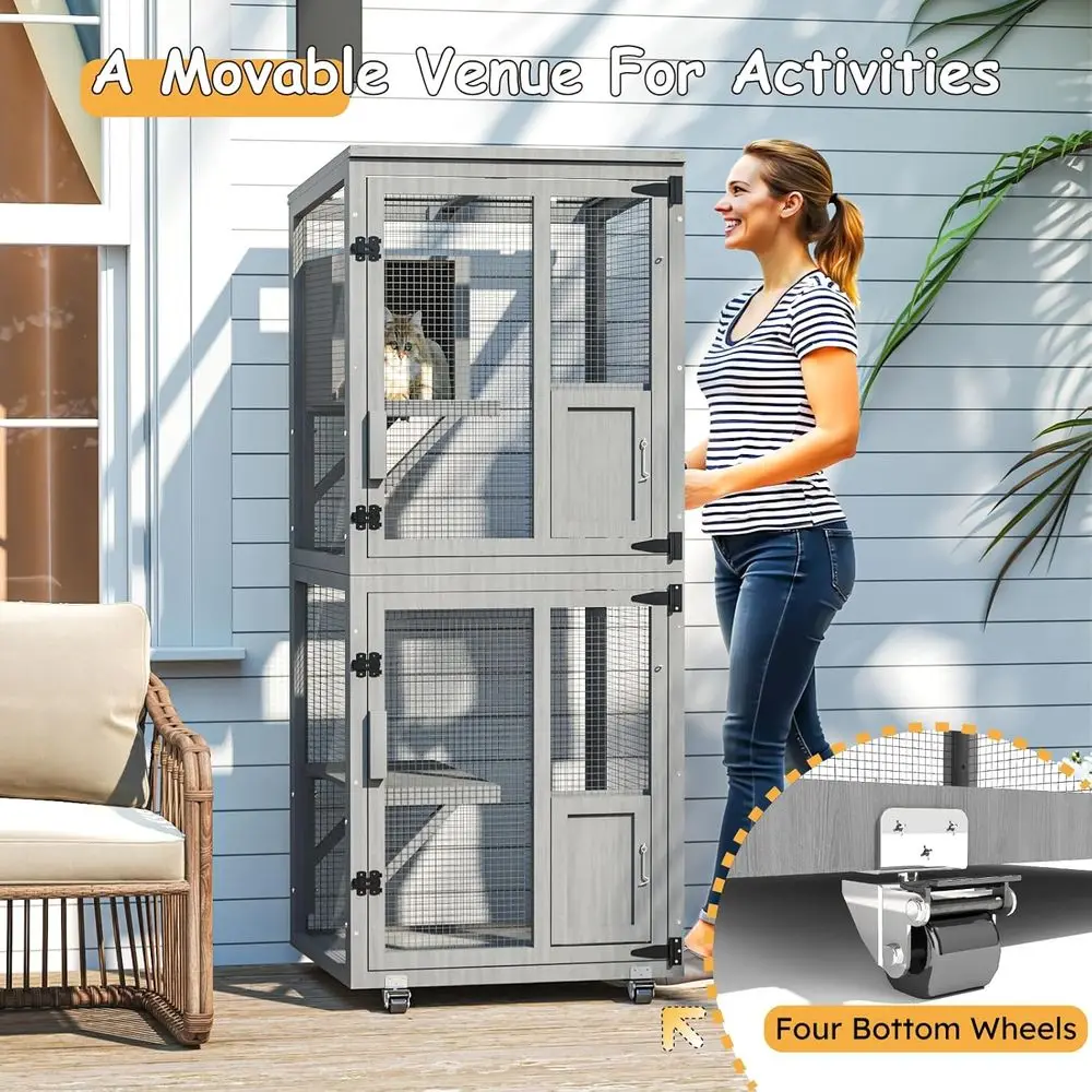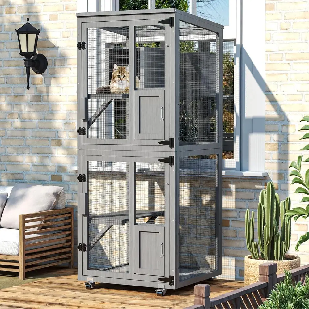 This 4-level outdoor cat enclosure provides a safe and spacious environment for cats. Equipped with sturdy wheels for easy mobility and repositioning. The waterproof roof protects pets from rain and sun. Includes a removable floor for easy cleaning and maintenance. An upgraded resting box offers a cozy space for cats to relax. Large windows allow ventilation and visibility for cats to observe their surroundings. Designed for outdoor use, keeping pets safe from predators. Durable materials ensure long-lasting performance and weather resistance. Ideal for multiple cats or kittens, supporting play and exercise. This enclosure combines safety, comfort, and convenience for outdoor feline fun.