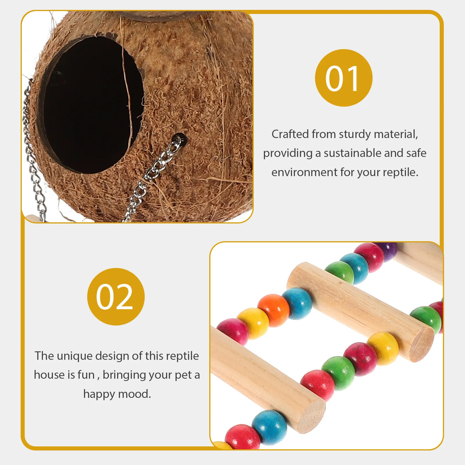 This coconut reptile hideout creates a safe and natural shelter for geckos and small reptiles. Made from real coconut shell, it adds a realistic look to any terrarium. The hanging design saves floor space while enriching vertical climbing areas. A built-in ladder allows reptiles to climb, explore, and rest comfortably. It provides a secure hideaway that helps reduce stress and anxiety. Ideal for geckos, small lizards, and other climbing reptiles. The enclosed space supports natural hiding and nesting behaviors. Easy to hang inside most terrariums and reptile cages. Durable and pet-safe for long-term habitat use. This coconut house enhances both comfort and décor in reptile environments