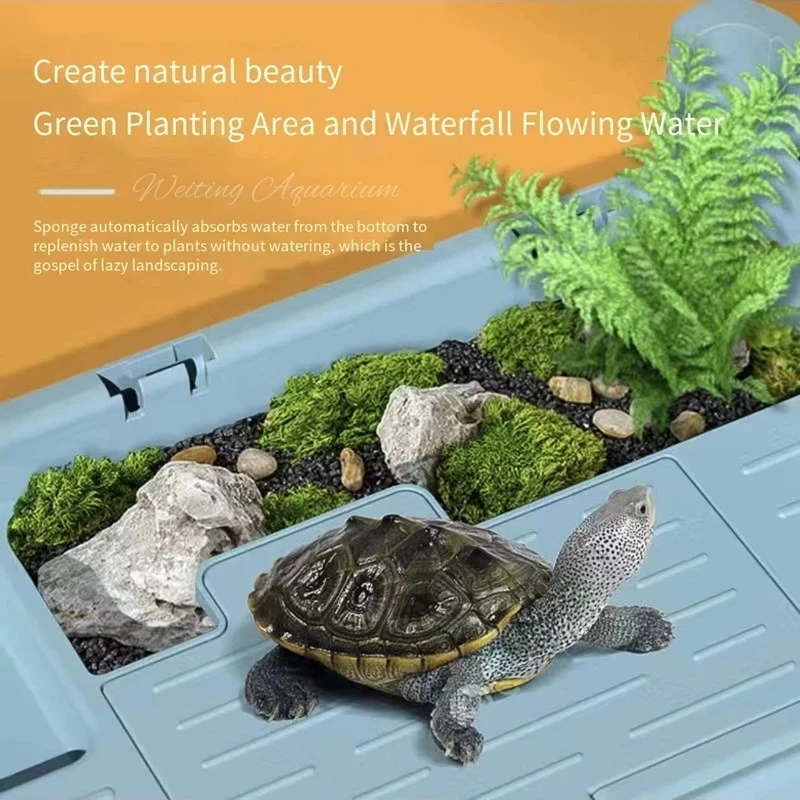 This turtle tank features a water-free change system designed for easy, low-maintenance care. Its built-in sunbed platform provides a comfortable spot for turtles to bask and stay healthy. The ecological landscaping design helps create a more natural environment for Brazilian turtles and other small species. A 220V 4W circulation pump keeps the water cleaner for longer. The clear, durable tank construction offers excellent visibility for watching your pet. Its compact design fits well in homes, offices, or small spaces. Setup is simple, making it great for beginners and busy owners. The tank supports both basking and swimming needs in one efficient layout. It promotes a healthier, more stable habitat for your turtle. This all-in-one system makes turtle care easier and more enjoyable.